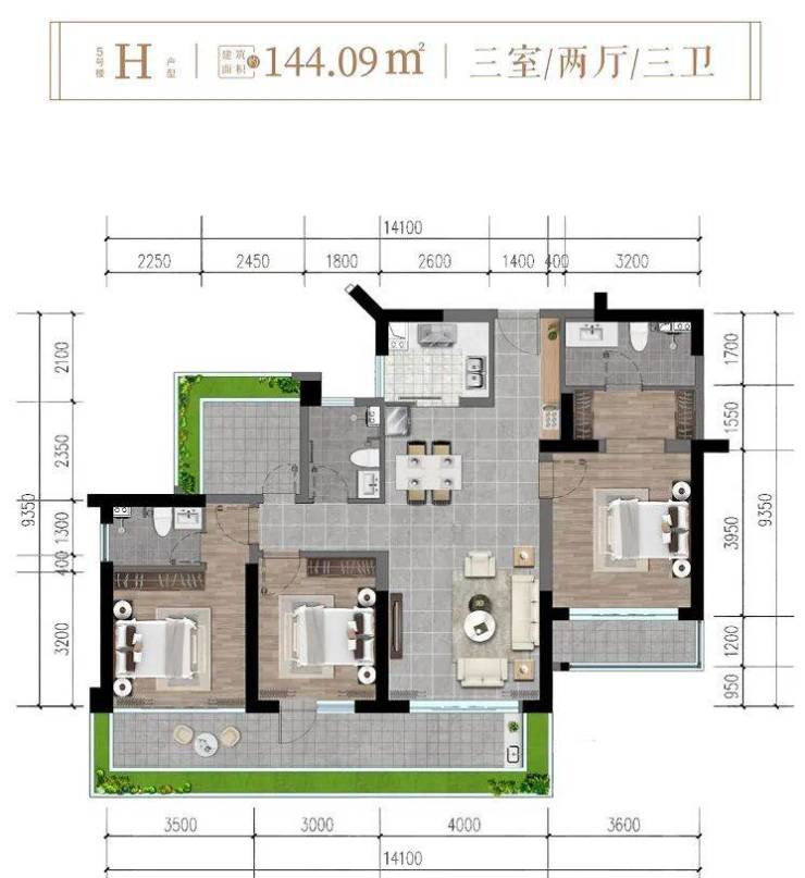 ✨5楼H户型约144㎡三房两厅三卫