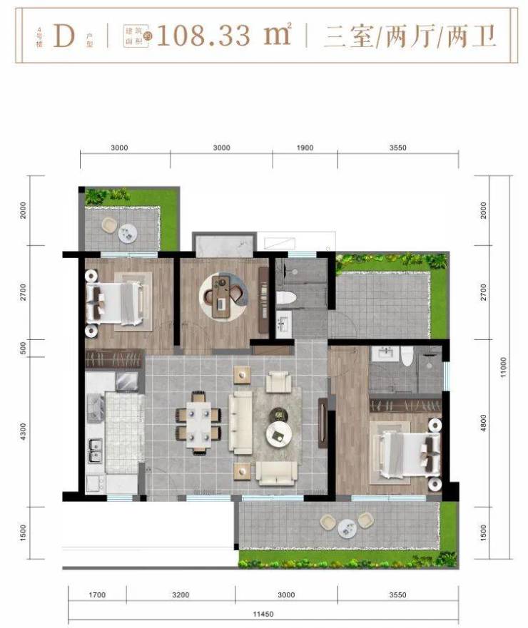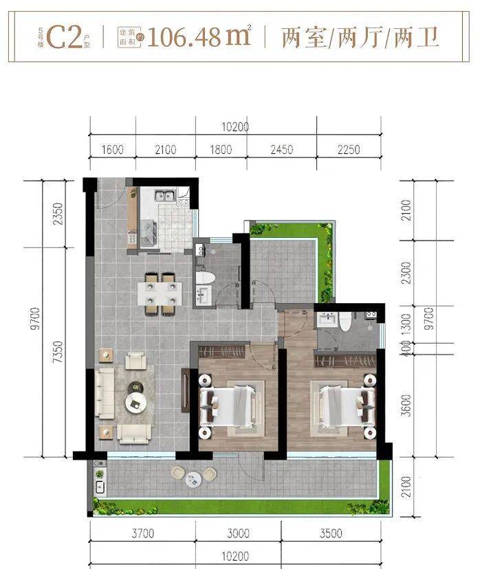 ✨5楼C2户型约106㎡两房两厅两卫