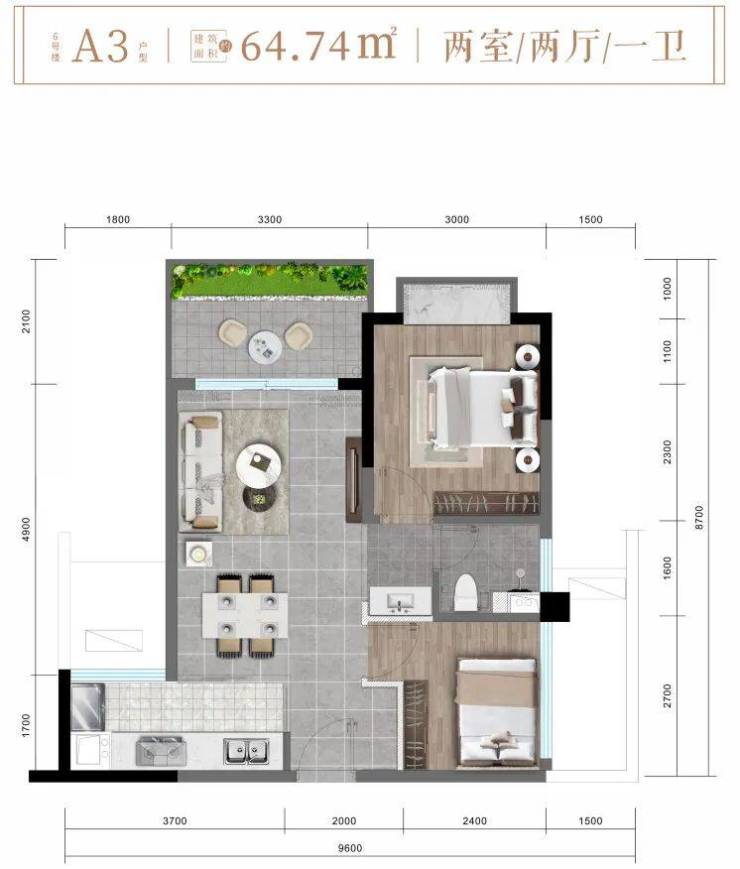 ✨ 6楼A3户型约64㎡精致两房两厅一卫