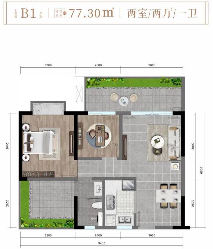 ✨ 6楼B1户型约77㎡舒适两房两厅一卫