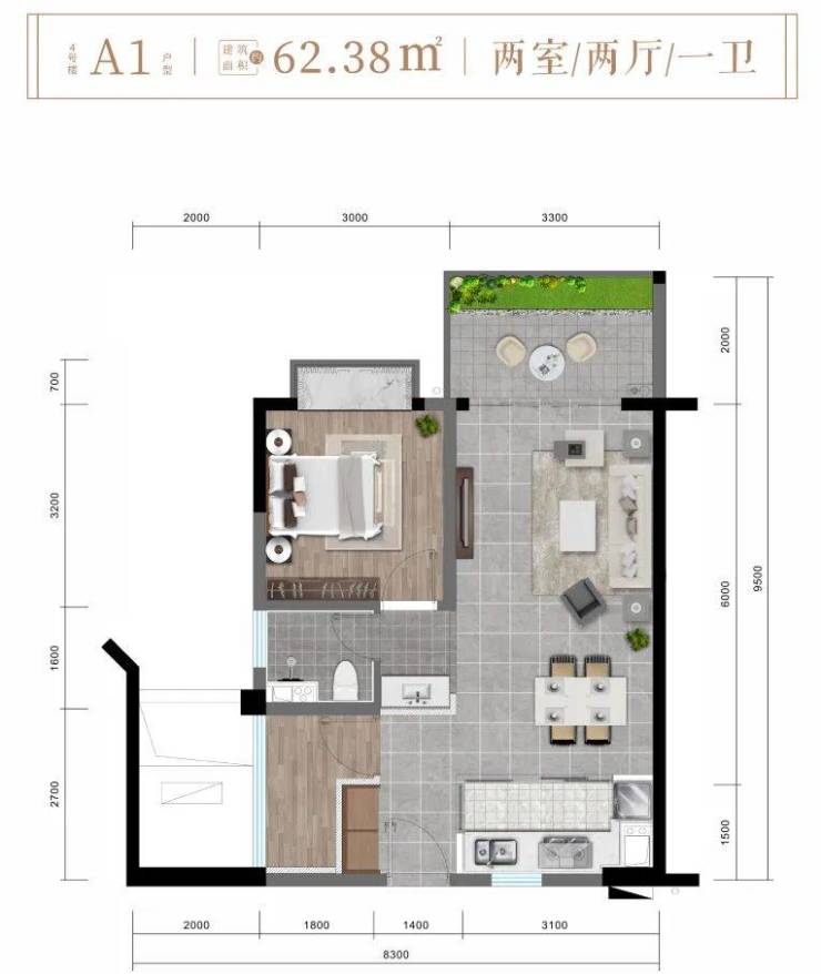 ✨4楼 A1户型约62㎡精致两房两厅一卫