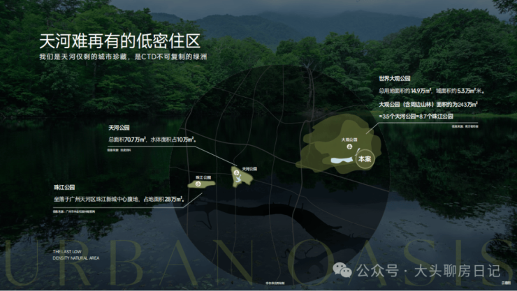 天河第三片绿洲,大观公园:公园用地面积约15万方,加上周边山林面积达到243万方,相当3.5个天河公园,8.6个珠江公园