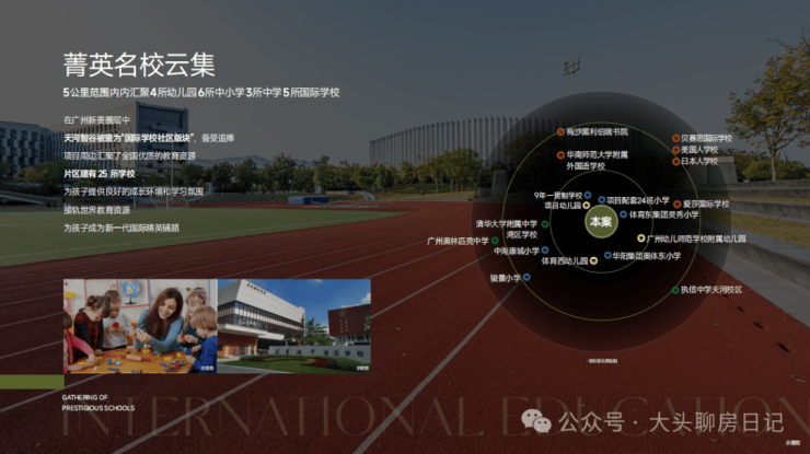 项目自配:15班幼儿园和24班小学,其中24班小学引进广州天河外国语教育集团合作办学,广州天河外国语学校自2012年4月创办以来, 学校迅速成长为广州优质教育品牌;同时享有北京大学大学先修课程实施学校、广州市教育工作先进集体等多项称号。