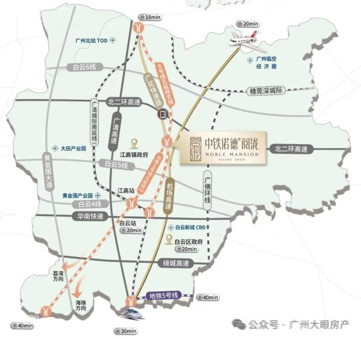 双向十车道广花快速路,无红绿灯、10分钟直达白云新城、3分钟高速口上环城高速、30分钟到珠江新城、2小时通达大湾区各大城市。