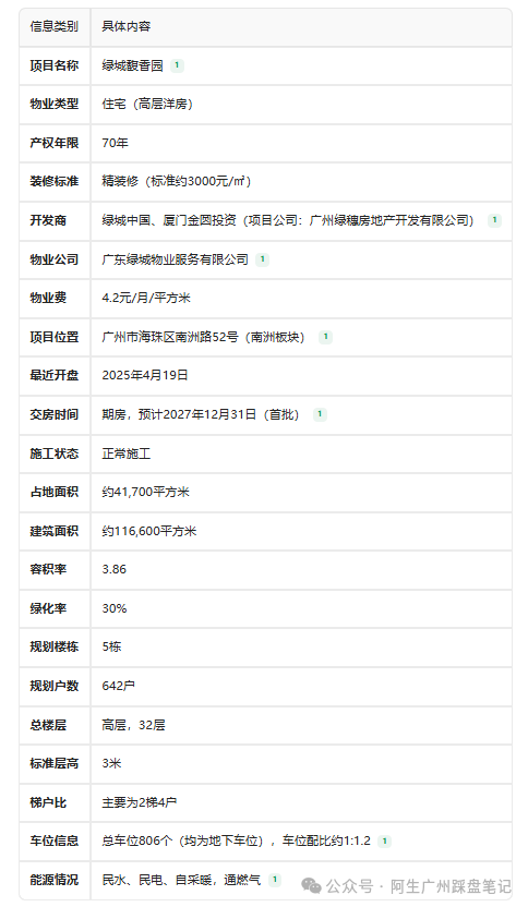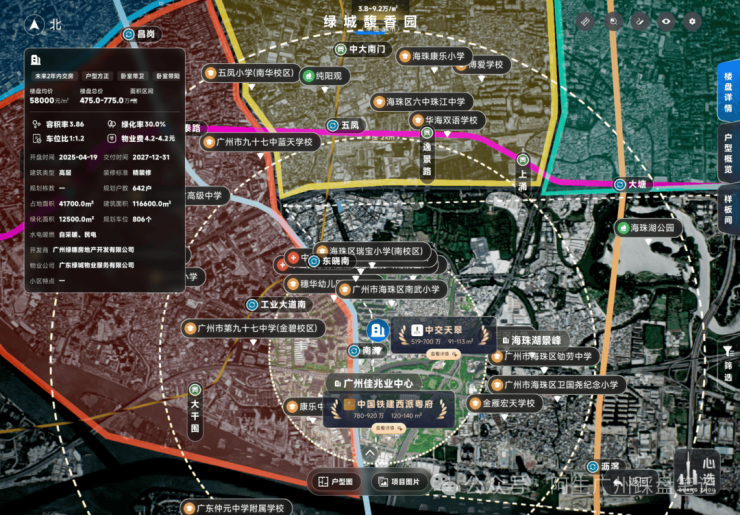 容积率约3.86,在海珠核心区偏低;围合式+蝶形楼栋,采光视野好。约1.2万㎡中央园林,以岭南十香园为灵感,打造“一轴一带五境六集七园”,全龄活动区齐全。