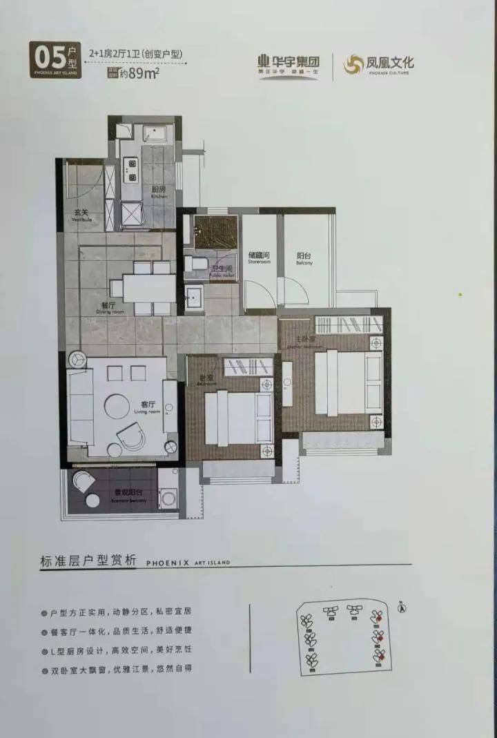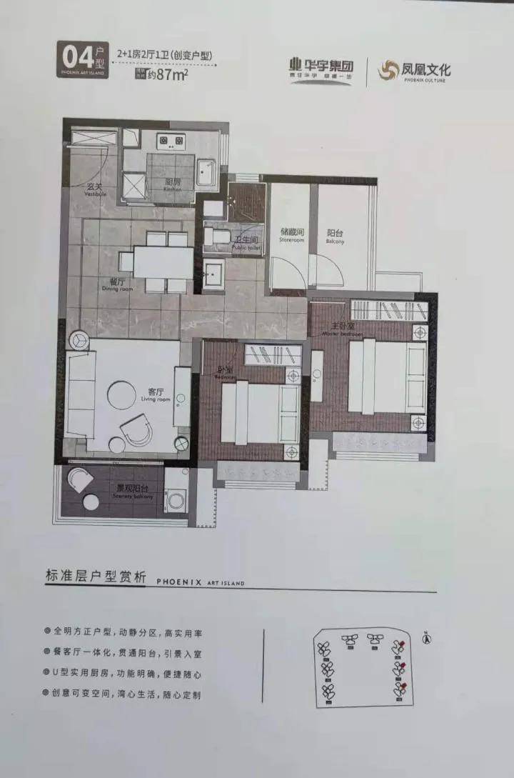 华宇·凤凰艺术岛的户型设计充分考虑到现代家庭的需求,所有户型均为南向布局,确保了良好的采光和通风。项目提供多种户型选择,面积从87㎡到124㎡不等,适合不同家庭需求。其中,102㎡的宽景横厅户型和稀缺的巨幕景观户型,为业主带来了更多的选择空间。每个户型都注重空间的合理利用与舒适的居住体验,居住者可享受无与伦比的江景和山景。