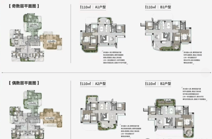 比如 110㎡的四房户型,实际使用面积可达 153㎡,实用率高达 139%。项目还运用了错层阳台设计,每个户型都有独特的空中花园,这样不仅增加了空间层次感,还提升了居住的舒适度和私密性,让高层洋房也有了别墅 “前庭后院” 的生活场景,住户可以在这里养花、种菜,甚至种树,尽情享受亲近自然的惬意生活。