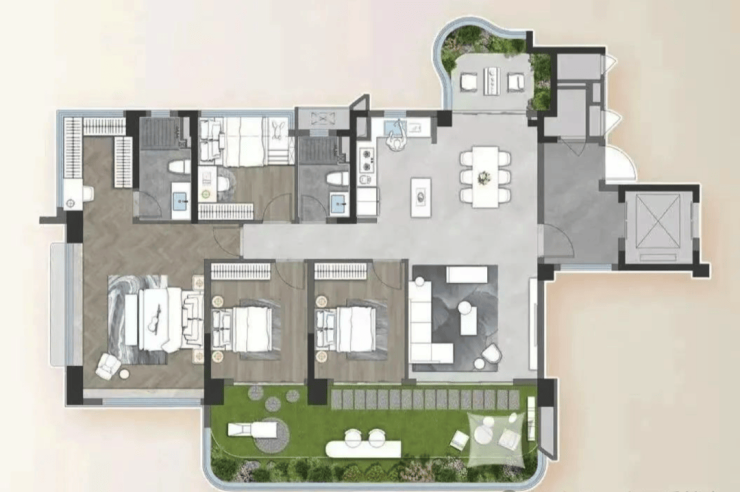 该户型把赠送面积都给了工区和主卧,全屋做到4+1房,空中花园连通公区,面积达到73㎡。最牛的是,主卧还带约14㎡的空中花园,打造一个私享庭院。