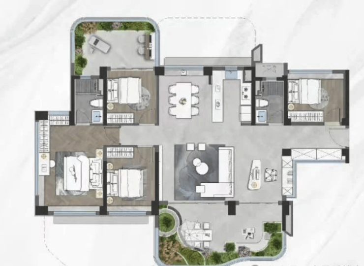 4+1房设计,南向4开间,约10.45米景观阳台,连通两个次卧,串联LDKG,空间尺度不言而喻。