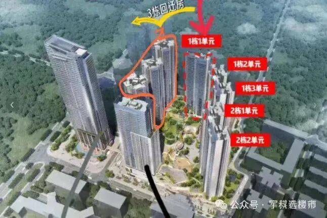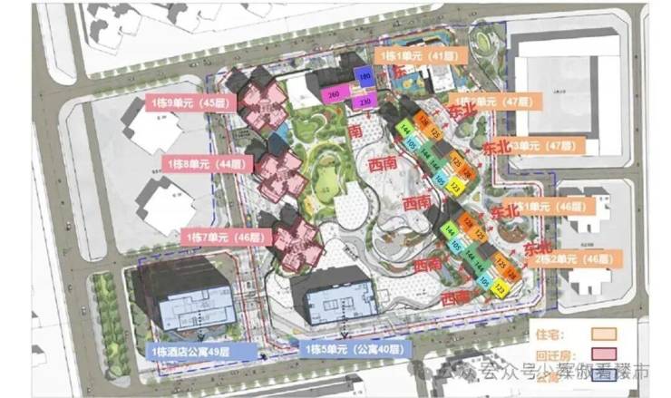 项目可售商品房主要集中于右侧,可售住宅763套,公寓190套、小地块:151套公寓商品房户型为建面约105-280平3-6房(具体户型以开发商公示信息为准,仅供参考),回迁房户型为建面约70-95平2-3房,预计26年6月竣工。