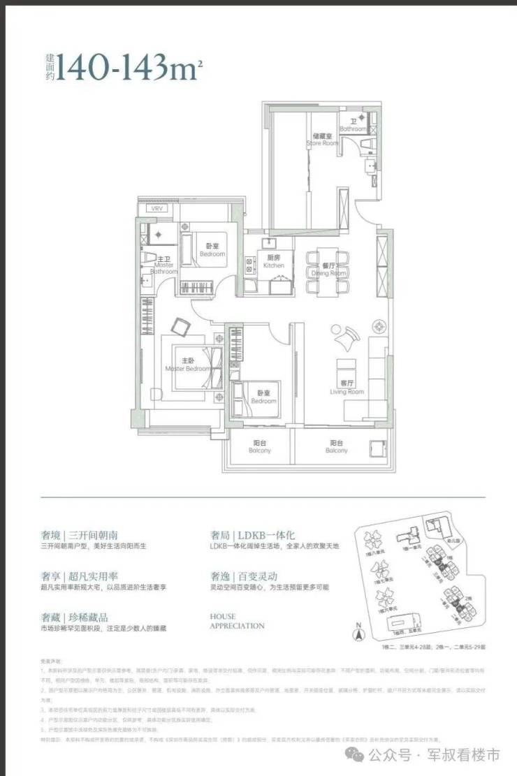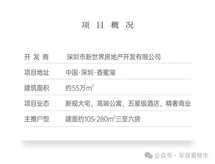 作为新世界发展在深圳的标杆力作,项目整体规划尊重湖岸生态,采用低密度、高绿化的建筑布局,最大化保留原生植被并引湖景入社区。建筑风格现代典雅,线条简洁而富有韵律,大面积玻璃与金属材质的运用,实现室内外景观的无界交融。产品线聚焦于城市顶级改善与珍藏需求,主力户型为270度环幕湖景大平层、空中复式及湖畔院墅。设计以“引景入室,四季风华”为核心,强调全景落地窗、空中观景露台、多功能家庭社交厅及国际化精装标准,将香蜜湖的四季景致与福田中心区的璀璨城景化为私人收藏,营造出静谧、尊贵且充满艺术感的居住体验。