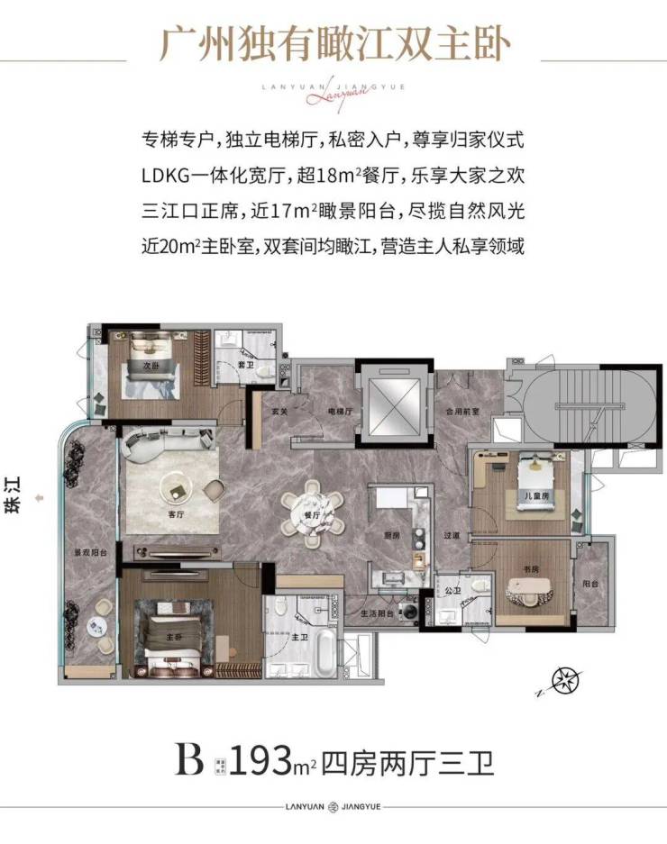 广州兰园江悦(别名:珠江悦府)是位于荔湾区白鹅潭CBD核心的高端江景豪宅,紧邻珠江三江交汇处,坐拥稀缺一线江景资源。项目由亚太顶尖设计团队打造,灵感源自豪华游艇,建筑立面融合柔美线条与珠江水波,营造出流动的艺术美感。
