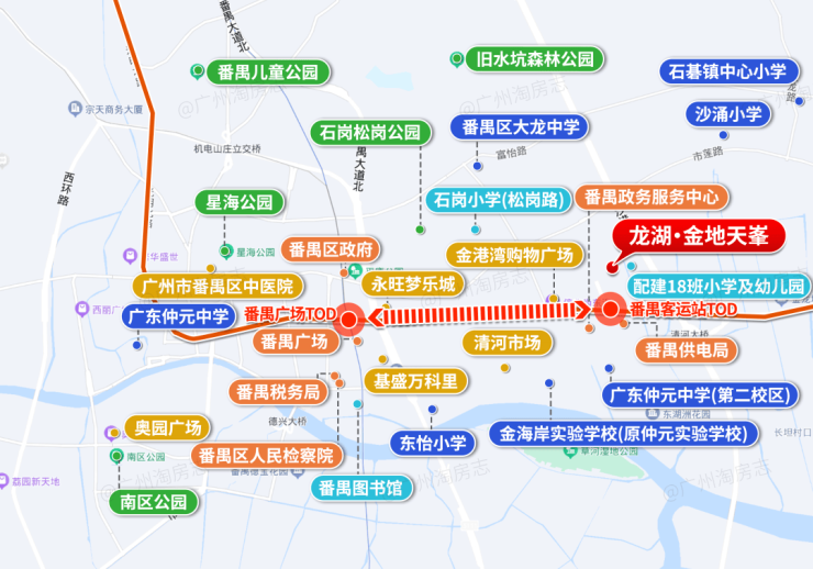 一站即达番禺广场站,里面有地铁3号线、18号线、22号线、3号线东延段 、17号线(规划中)五轨交汇,一站畅行琶洲,两站通勤珠江新城。