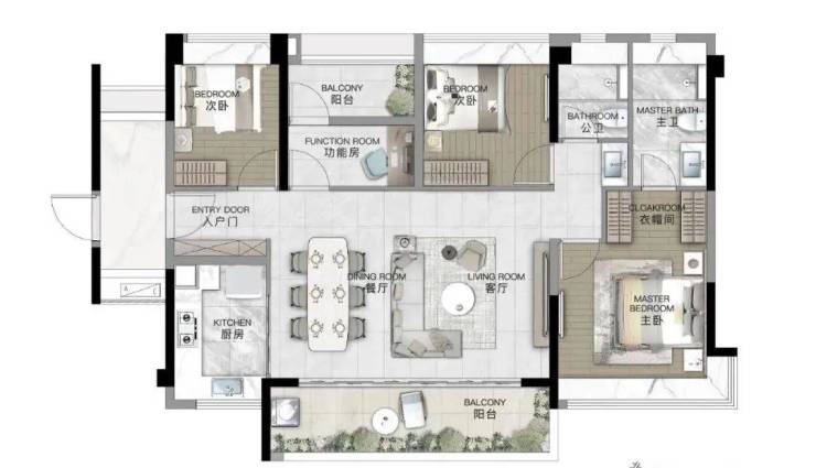 143㎡四房实现四面朝南的奢阔格局,南北双阳台让清风穿堂而过,园林景致如画卷般在眼前舒展。