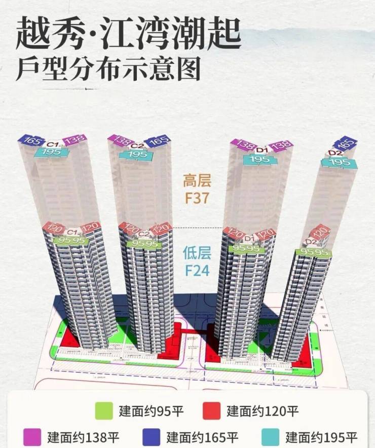 项目共规划4栋住宅楼,均为37层,分高低区设计,而且梯户比跟户型都各不相同:
