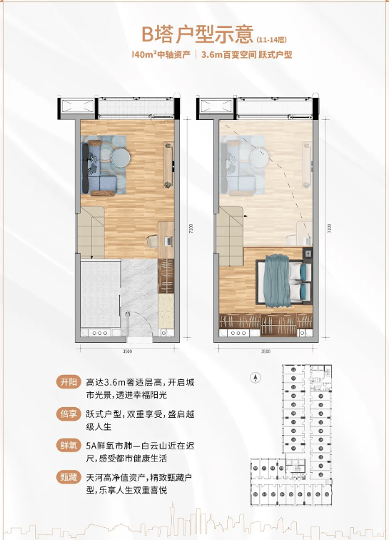 观云大厦:推售建筑面积约为36-43㎡酒店行政公馆和31-54㎡中轴精品空间,空间高度为3.4-3.6米,满足自用、办公、投资多重需求。