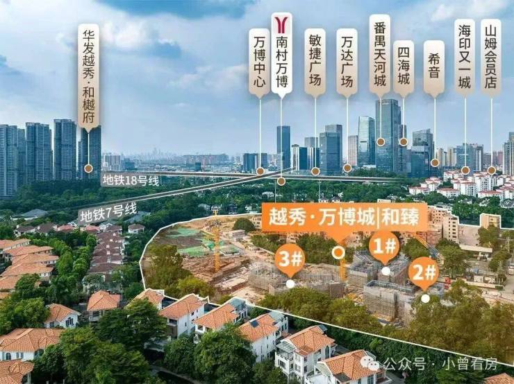 项目到南村万博E2口约1公里,可以乘坐7号线18号线,7号线往西通到南站和佛山的顺德美的大道。往东北方向连接我们的大学城,然后上去科学城的燕山站,把东部连起来啊。18号线从南沙天河,南北贯通,3站琶洲,4站冼村。后期往南通中山,往北到花都。