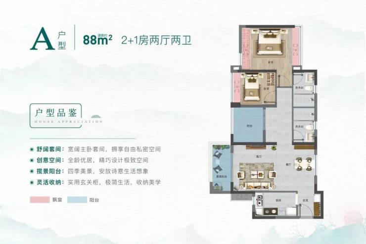 1. 88㎡,三房二卫户型