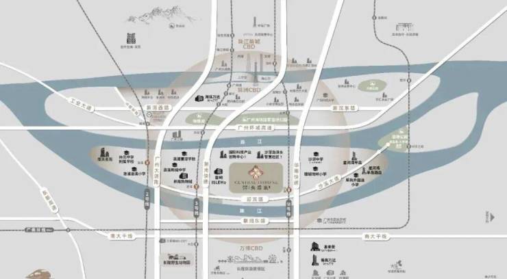 ◎交通中心 10大路网3纵:新光快速、华南快速/番禺大道、广州大道南,实现15分钟珠江新城、琶洲、海珠中心,10分钟万博核心2横:环城高速、南大干线两条横向路网,立体交通路网,便捷出行2地铁:1站万博、2站琶洲、3站广州塔&珠江新城CBD。