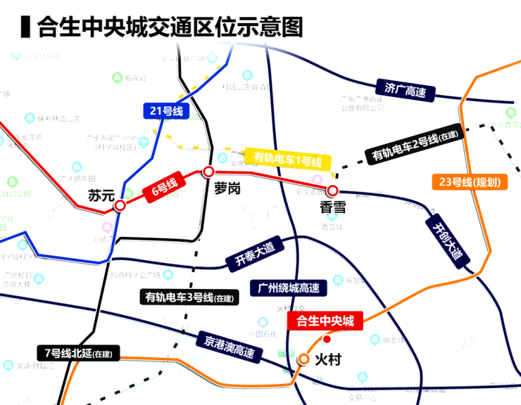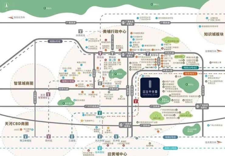 自驾方面项目门口有开放大道,目前正在拓宽建成双向8车道,周边有广深高速、广园快速等。