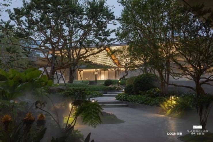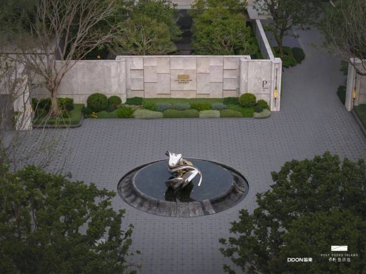 入口弧形景墙宛若缓缓舒展的舷梯,实现从城市界面到江心秘境的自然过渡,铺就归家仪式序章。