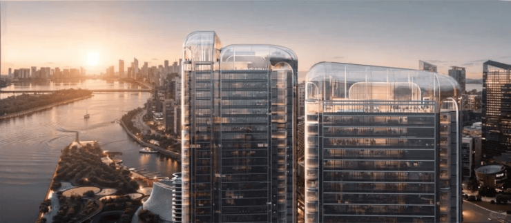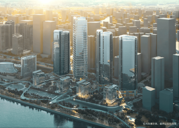 首期规划两栋超高层商业塔楼,分别为 50 层、建筑高度 210.3 米,及 48 层、建筑高度 202.5 米,临江再配建两栋低密总部办公建筑,构筑层次分明的滨江天际线。