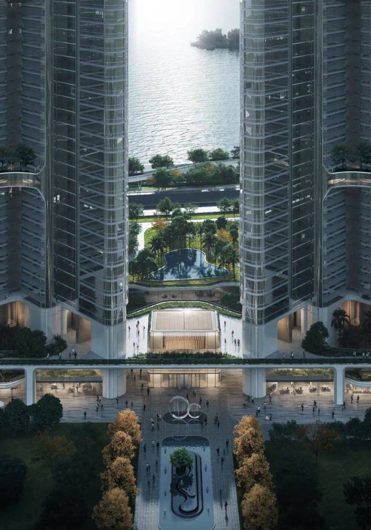 项目匠造广州首创雁型建筑布局,搭配通透玻璃幕墙立面,建筑形体向两侧江景舒展打开,最大化延伸临江界面。
