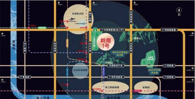 岭南1号就位于六片山,在广州新中轴的北端,既享有城市的繁华,又根植于美好的自然生态。距离地铁十四号线东平站1.6公里,靠近北二环高速公路、新广从公路、北太路、106国道等高快速路和主干道,距离白云新城仅约5公里,距离天河仅约10公里,恰好契合了当代精英阶层"既要便捷又要静谧"的生活追求。