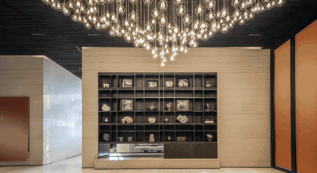 它可以模拟自然天光,与香槟金铝板和各种奢石等,构成一幅赏心悦目的归家画面。