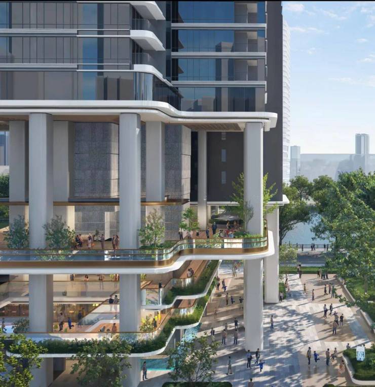 架空设计使得原本独立的建筑与环境产生了对话关系,营造出自然与建筑共融互渗的格局。越秀还想通过空间创造与城市的关系,还空间予城市,为人们开拓一个高舒适度、低密度的新体验空间。