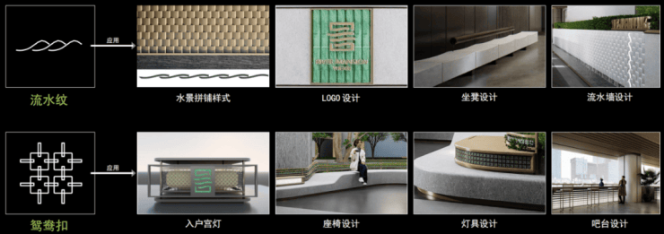 此外,将岭南地域文化融于现代艺术景观造园之中,满眼岭南风情。比如,提取岭南四大古典园林之一余荫山房建筑元素,重组、定制寓意美好的鸳鸯扣。比如,取岭南画派的山水元素,将流水纹样进行提炼,弯弯曲曲,曲曲折折,形成岭南山水意境。