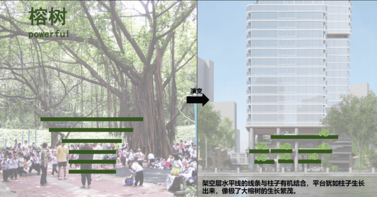 留存广州城市记忆,架空层立面以“榕树”为概念,水平线条与柱子有机结合,仿佛由下而上挺拔生长,呈现枝繁叶茂之象,使建筑与江色交相辉映。