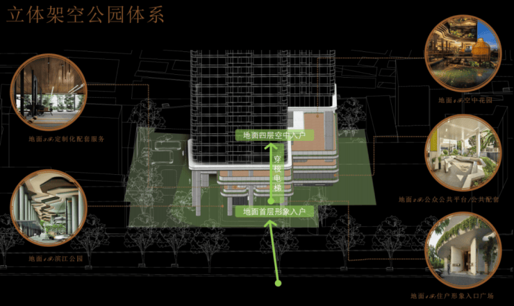 得益于项目架空设计,形成滨江大道、酒店式落客区、入户电梯厅、空中入户平台、南/北塔入户等新型多重归家体系,每一次归家都是仪式感,绿意萦绕。