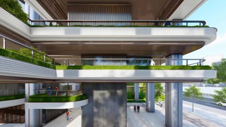 底部架空层4个花园,最高可达约8米,南北塔楼屋顶各1个云端花园,形成六重立体垂直花园,总面积约5630㎡。