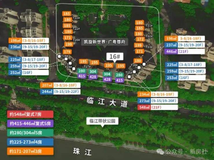 凯旋新世界三期广粤尊府将推出少量T17、T18、T21等楼栋住宅,三期T17和T18栋是广粤尊府楼王级别产品,大面积户型头排一览珠江无敌景观视野,如此顶豪可满足广州高净值人士的居住需求。