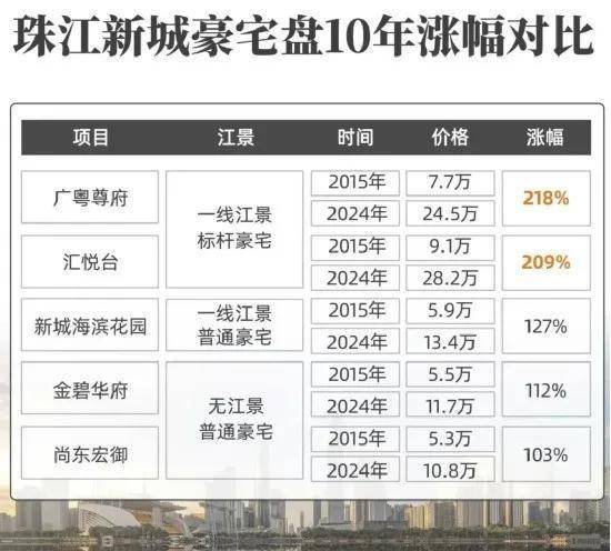 像同在珠江新城东区,占据一线江景的标杆顶豪盘,不仅总价更高,涨幅也远远甩开其它没有江景或者品质一般的豪宅盘。