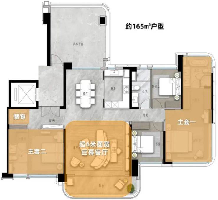 165㎡户型:尺度进一步提升,客厅面宽达到6.1米,通风采光一流;同样带双主套三卫,且卫生间全明,室内设置了“八百库”储物空间,收纳更科学。