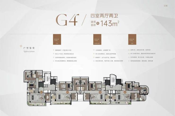 项目的总规划为349户,并包含多个不同类型的住宅产品,以满足不同购房者的需求。除了4栋(R1-R4)政府配建房外,项目对外销售的产品主要包括叠墅、小高层和高层,每户户型建面均为143㎡。这使得该项目满足了不同家庭结构的需求,尤其适合追求大空间和高品质生活的高端家庭。