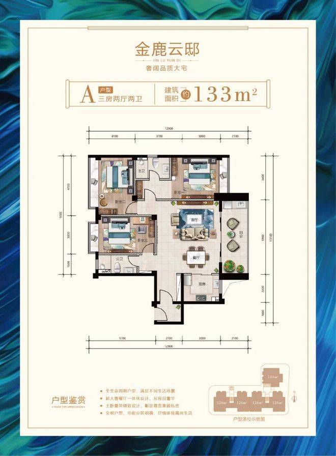 建筑面积约126㎡-133㎡奢阔品质大宅;全生命周期户型,满足不同生活场景;超大客餐厅一体化设计,从容且奢华;主卧套房精致设计,彰显尊贵兼顾私密;全明户型、功能分区明确、尽情体验高尚生活;