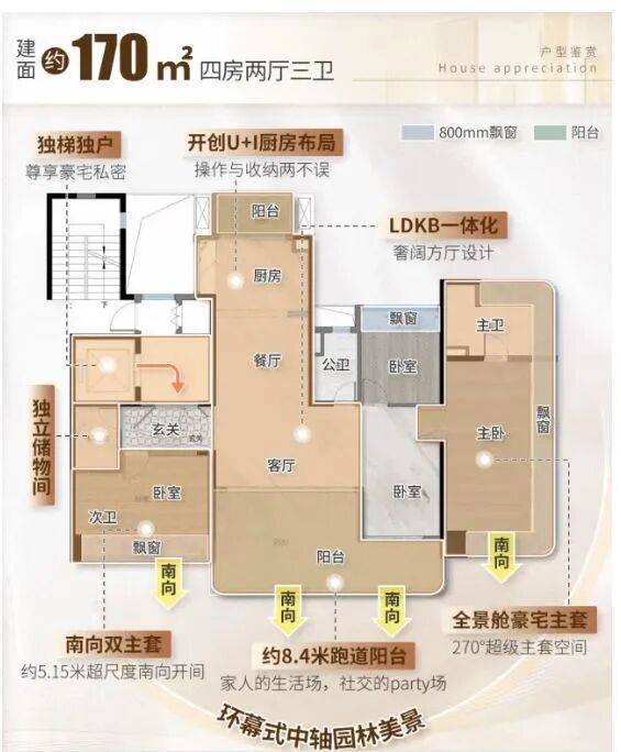 项目作为 “超新规” 住宅,在户型设计上实现重大突破,实用率高达 120%,所有户型层高 3 米以上(部分楼栋 3.3 米),空间尺度远超传统住宅。二期主打 127-170㎡四房,全为南北对流双阳台设计,核心亮点集中在 “全景舱” 与 “空间灵活性”: