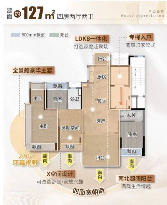 127㎡户型做到四面宽朝南,南向采光面达 13.8 米,LDKB 阔厅与主套全南北对流,穿堂风贯穿全屋;客厅与次卧可打通形成 7.3 米超级方厅,127㎡空间享受 150㎡+ 的尺度感;主套采用 270° 弧形转角玻璃设计,视野最大化,配置独立卫浴与豪华衣帽间,私密与舒适兼具。