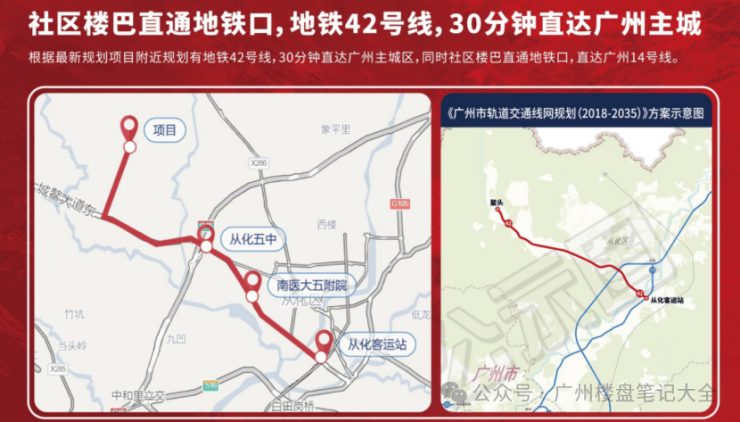 42号线距离项目不足一公里。建成通车后,地铁通行三十分钟直通广州主城.