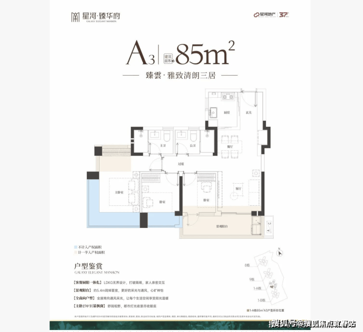 - 85㎡三房:三开间朝南,LDKG宽厅,270°观景主卧,小面积大格局;