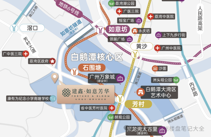 生活于此,更可从容穿梭于传统与新潮之间。项目雄踞荔湾西关与白鹅潭CBD黄金交汇处,执掌“老城烟火”与“新城万象”双重价值。坐拥永庆坊、荔枝湾广府文化原点的同时,尽享千亿鹅潭,汇聚了广州首座万象城(预计2026年上半年开业)、聚龙湾太古里(一期预计2025年底开业)等重磅项目,健康港星河COCOPARK、山姆会员商店(荔湾店)(预计2025年底开业)、白鹅潭大湾区艺术中心,世界级商圈触手可及。(信息来源:广州市人民政府官网)