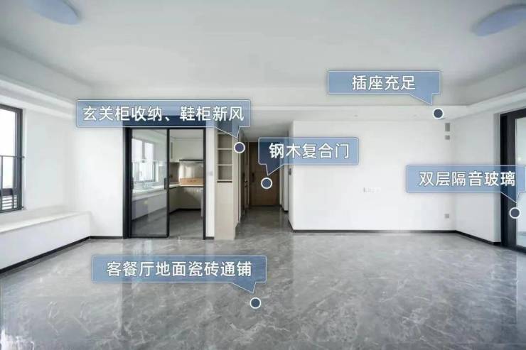 其三,自带新风系统,主卧天面藏有灯带;客餐厅地面瓷砖通铺,卧室木地板饰面,入户大门、房间门厚重结实;双层玻璃,降低噪音……用材用料十足。