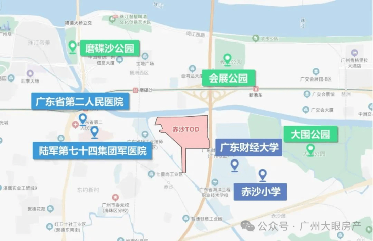 越秀琶洲南TOD项目位广东省广州市海珠区金运路1号,海珠赤沙TOD地块东侧紧挨华南快速干线,北侧隔着黄埔涌,对岸就是高楼林立的电商总部琶洲西区。