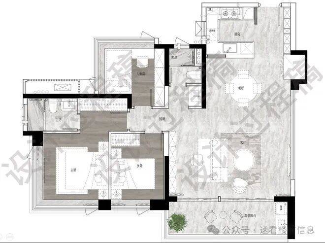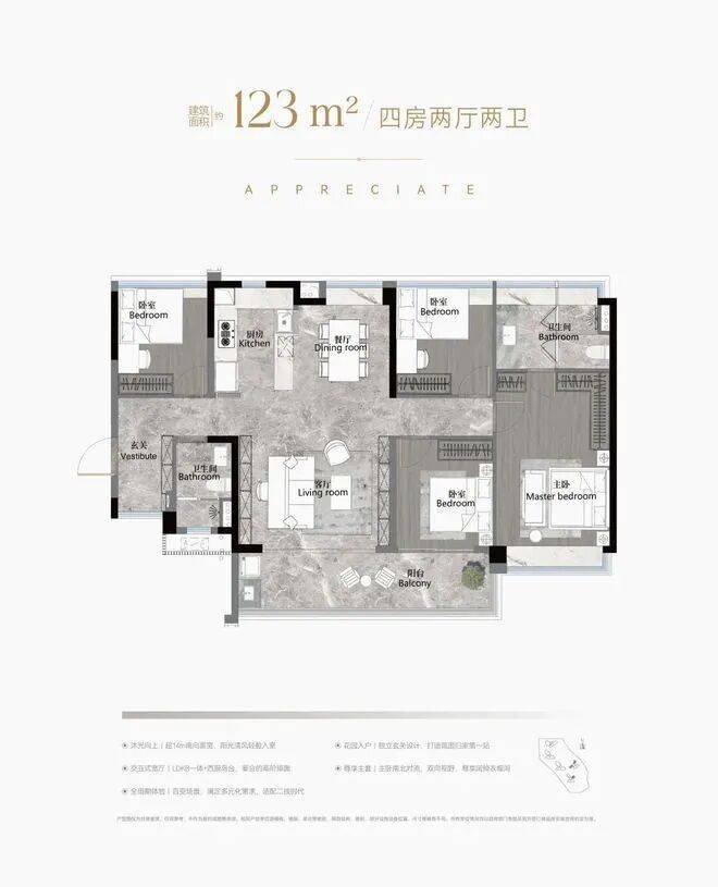 建面123平四房两卫,南北对流户型,LDKB一体化设计,约7米长景观阳台,主卧设置L型衣帽间,三个次卧差不多大小,转角玄关用作收纳。