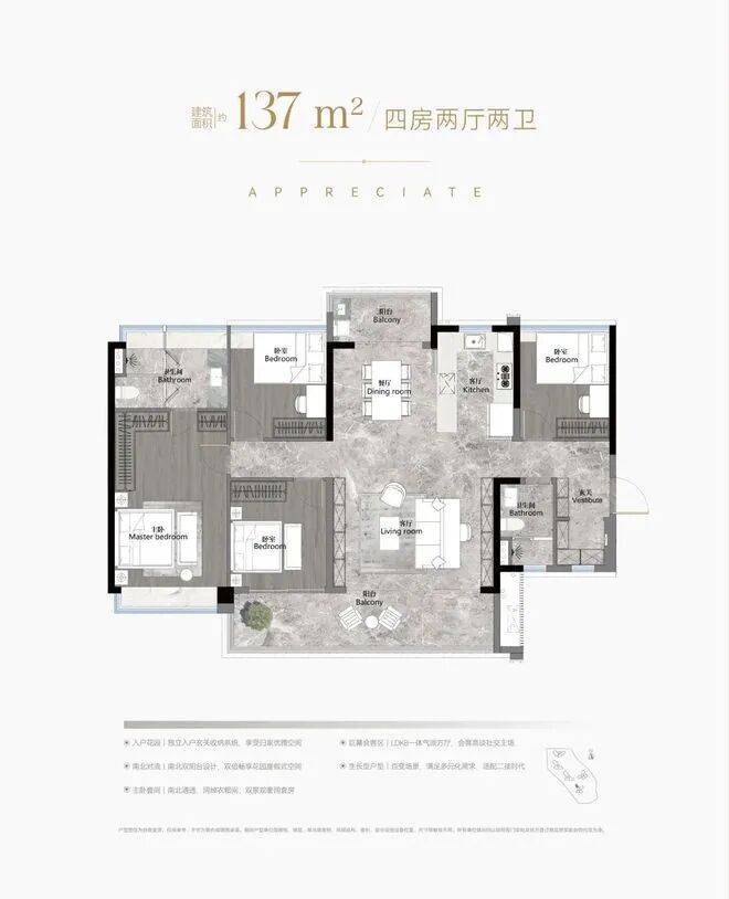建面137平四房两卫,带入户花园,南北对流,大客厅+LKDB设计,主卧套房,同样也可以对流。