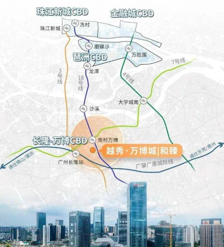 地铁3/7/18号线交汇,步行至南村万博站约1.3公里,3站达琶洲、4站至珠江新城