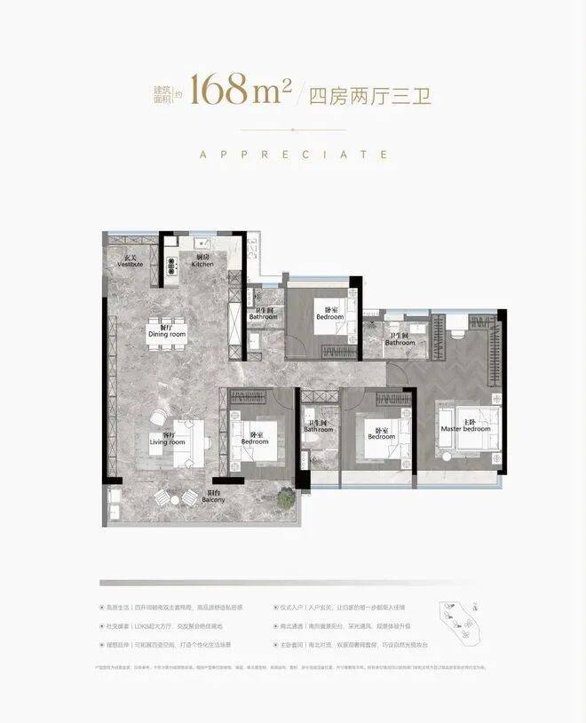 建面168平四房三卫,放大版的142平,做了双主套,适合三代同堂家庭,单边位,南北对流采光通风都非常好,约40平的大房厅,景观阳台开间约8.2米.